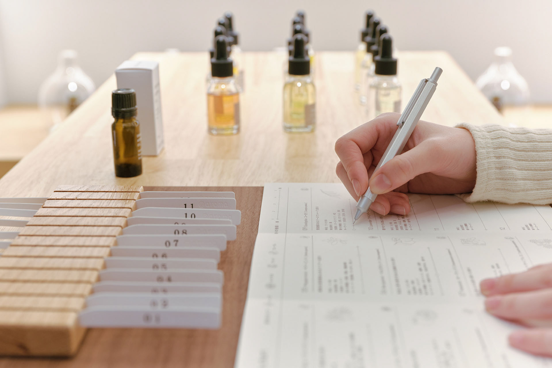 レクチャーを受けながら書き込んだり制作番号で次回も同じ香り制作可能なので保管いただくため、風合いがあり厚みのある紙を指定しました。